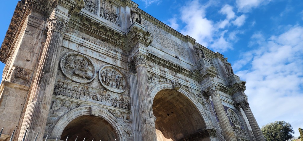 ㅤThe Arch of Constantine is a triumphal arch in Rome commissioned by the Roman Senate to honor Emperor Constantine the Great. Dedicated in 315 CE, it commemorates his victory over Maxentius at the Battle of the Milvian Bridge three years earlier. Situated between the Colosseum and the Palatine Hill, it is the largest Roman triumphal arch ever built. A notable feature of its decoration is the extensive use of spolia, which are reliefs and sculptures repurposed from earlier monuments dedicated to the emperors Trajan, Hadrian, and Marcus Aurelius, with the heads of those emperors re-carved to resemble Constantine.